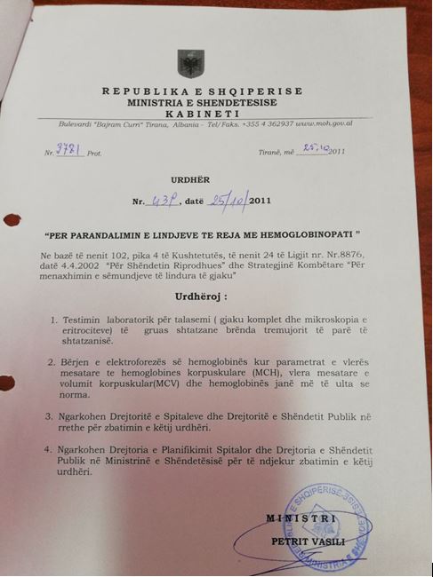 Bazuar në Urdhërin  nr. 439, date 25.10.2011 “Për parandalimin e lindjeve të reja me hemoglobinopati”, brenda tremujorit të parë të shtatzanisë gruaja shtatzënë bën testimin laboratorik për talasemi. Gjithashtu bëhet edhe elektroforeza e çiftit.  Por aktualisht në institucionet publike nuk bëhet analiza molekulare e ADN-së për të përcaktuar mutacionet. (Urdhëri bashkëlidhur)