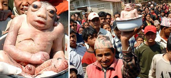 Fëmija pa qafë i cili e ka kokën pothuajse të gjithen të zhytur në trup ka lindur dhe me sy jashtëzakonisht të mëdhenj. Ai ka lindur në vitin 2006 në Nepal. Bebi vdiq një orë pas lindjes.