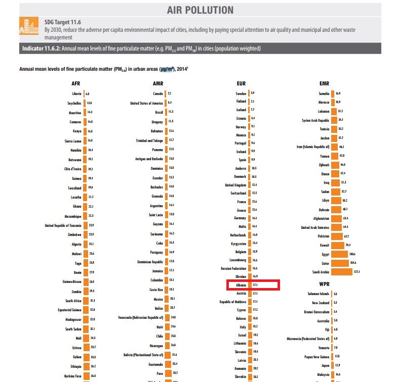 Shqipëria ka një vlerë mesatare prej 17.1 μg/m3 të grimcave të ngurta PM 2.5, që vjen kryesisht nga shkarkimet e automjeteve, infrastruktura e rrugëve në ndërtim.