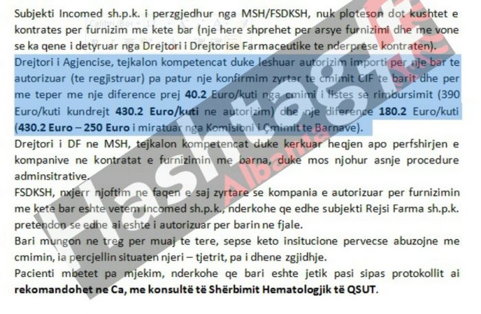 “Ende pa patur nje çmim zyrtar te barit Fludarabine oral 10mg, Drejtori i Agjencise Znj. Alma Skenderaj, ne shkelje te flagrante me ligjin e barnave, autorizon importin e barit Fludara oral 10mg, sipas autorizimit te importit nr. 16529, date 14.07.2015, me nje çmim CIF 430.2 Euro/paketim. Miratimi i cmimit CIF nga Komisoni i Çmimit te Barnave, eshte kusht thelbesor qe paraprin importin e nje bari te autorizuar ne vendin tone. Nese ky cmim nuk eshte i miratuar, nuk mundet kurrsesi te leshohet autorizimi i importit, element perberes i formatit te tij”, shkruhet në MEMO”.
