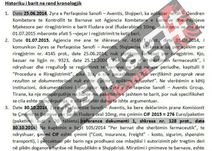 Bëhet fjalë për ilaçin e quajtur ‘Fludarabine-10mg’ ekskluzivitetin e së cilës e ka pasur kompania Sanofi-Aventis, ndërsa kur kjo e fundit aplikoi në Korrik-2015 për rinovimin e të drejtës së importit të ilaçit, kërkesa u refuzua nga Komisioni i Ministrisë së Shëndetësisë. MEMO-ja zbulon se refuzimi nuk u shoqërua me arsyetim.
