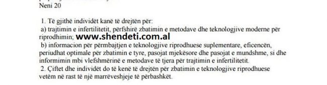 - Të gjithë individët kanë të drejtën për: a) trajtimin e infertilitetit, përfshirë zbatimin e metodave dhe teknologjive moderne për riprodhimin; b) informacion për përmbajtjen e teknologjive riprodhuese suplementare, eficencën, periudhat optimale për zbatimin e tyre, pasojat mjekësore dhe pasojat e mundshme, si dhe informimin mbi vlefshmërinë e metodave të tjera për trajtimin e infertilitetit.
