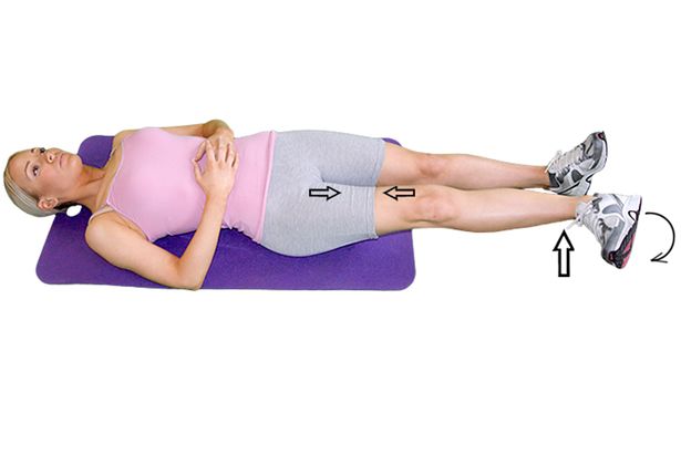Ushtrime: Të punosh me kuadricepin ndihmon në forcimin e gjurit. Shtrihuni me shpinë dhe me ngadalë ngrijeni këmbën nga toka.