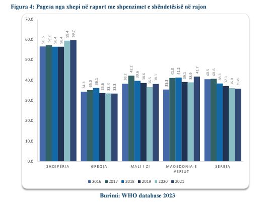 Edhe pse në vitin 2013, qeveria shqiptare premtoi shëndetësi falas, Shqipëria kryeson listën e vendeve ku shpenzimet për shëndetin paguhen direkt nga qytetarët. Shëndetësia shqiptare është e nënfinacuar, kjo duket se është dhe arsyeja kryesore pse shqiptarët paguajnë nga xhepi 60% të kostos totale për çdo ditë që janë të sëmurë.