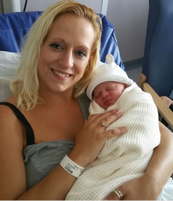 Infermierja Kat Smith, 30 vjeç, kishte vetëm gjysmë ore që kishte lënë punën para se të lindte të voglin e saj. Ajo thotë se nuk ndjeu asnjë dhimbje gjatë lindjes.