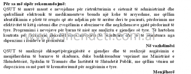 Në kushte të tilla, Kontrolli i Lartë i Shtetit ka kërkuar “marrjen e masave të nevojshme për ristrukturimin e sistemit të administrimit dhe qarkullimit elektronik të medikamenteve brenda një kohe të arsyeshme, me qëllim identifikimin e plotë të rrugës që ato ndjekin për të arritur deri te pacienti, përdorimin me efektivitet të këtij sistemi dhe zvogëlimin e abuzimeve dhe neglizhencave gjatë përdorimit të tyre. Programimi i nevojave për barna të nisë me analizën e gjendjes së tyre. Të hartohen kontrata për furnizime fleksibël sipas nevojave të rezultuara dhe jo të orientuara nga shpenzimi i fondeve të prokuruar”.
