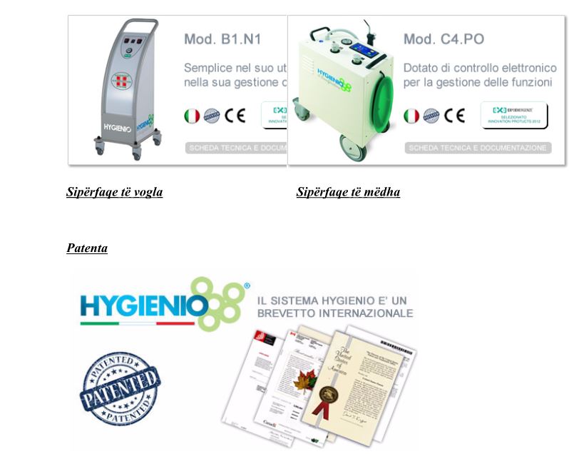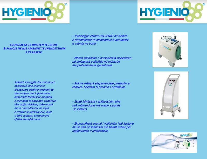 Teknologjia elitare Hygienio në fushën e dezinfektimit të ambienteve synon mbrojtjen e shëndetit të personelit dhe pacientëve në mënyrën me profesionale dhe garantuese.