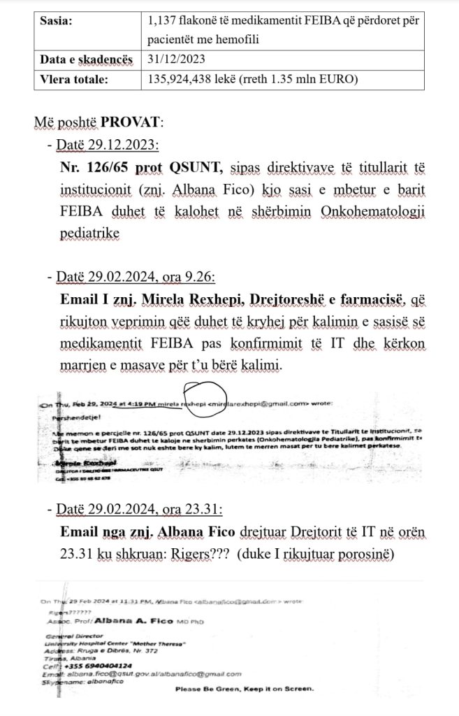 Skandali qëndron në faktin që me urdhër të ish drejtoreshës së QSUT Albana Fico, nëpërmjet një Memoje Nr. 126/65 datë 29.12.2023 janë dhënë direktiva të titullarit të institucionit Albana Fico që kjo sasi e mbetur e barit FEIBA të kalonte në shërbimin Onkohematologji pediatrike.