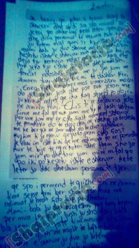 S’e besoj që e kam kaq të shkurtër jetën dhe s’e di sa do mund të jetoj, po shkruaj këtë letër për familjen dhe disa persona të veçantë. Kur ta shihni ju lutem mos qani, ky ishte fati im. Mami, babi, ju dua shumë, mos u mërzisni, kështu ishte e shkruar, nuk kemi çfarë të bëjmë. Doja t’iu kërkoj ndjesë që po iki kaq e re. Ju dua. Ju mblidhni forcat, ndoshta s’jam me ju po jam në zemrën tuaj.