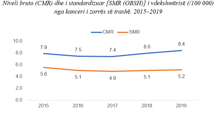 Megjithëse vdekshmëria bruto nga kanceri i zorrës së trashë është në rritje ndërmjet viteve 2015 e 2019, vërehet se vdekshmëria e standardizuar, për këtë periudhë, është e qëndrueshme, dhe madje mes 2019 dhe 2015 ka një ulje me pothuaj 8%. Kjo do të thotë se, nëse nuk do të kishim një rritje të moshës mesatare të popullsisë gjatë këtyre viteve, nuk do të kishim rritje të vdekjeve nga ky kancer. Në këtë mënyrë, risku specifik për çdo grup-moshë për të vdekur nga kanceri i zorrës së trashë praktikisht ngelet i njëjtë. Kjo prirje që konfirmohet edhe në vdekjet e ashtuquajtura ‘të parakohshme’ për grup moshën 30-69 vjec, mund të jetë shprehje e një diagnostimi më të hershëm dhe trajtimi në kohë të këtij kanceri.
