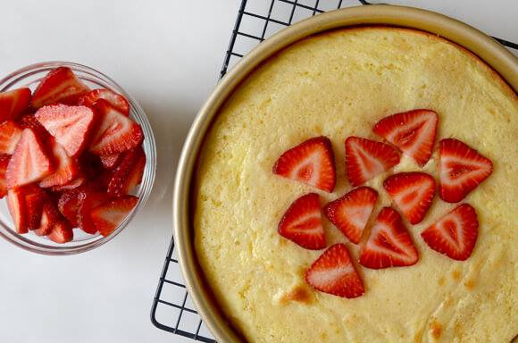 5. Vendosni në tepsi gjysmën e brumit të parë. E mbuloni me perzierien e kremit te djathit dhe me pas i hidhni brumin e mbetur përsipër. Piqeni për 20minuta. E nxirrni nga furra per t’i shtuar luleshtrydhet dhe e fusni sërish në pjekie për 25-30 minuta të tjera!/Blerina Bombaj, dietologe