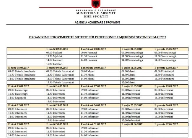 Blertina Koka Sezoni i testimeve për licencat e reja në profesionet e mjekësisë fillon më 2 maj. Agjencia Kombëtare e Provimeve ka publikuar kalendarin kur do të zhvillohen provimet për profesionet e rregulluara të mjekut, farmacistit, stomatologut, infermierit, mamisë, fizioterapistit, logopedistit, teknikut të imazherisë dhe teknikut të laboratorit. Provimet e shtetit për këto profesione të … Continue reading Licencat e reja, publikohet kalendari i testimeve për 9 profilet mjekësore