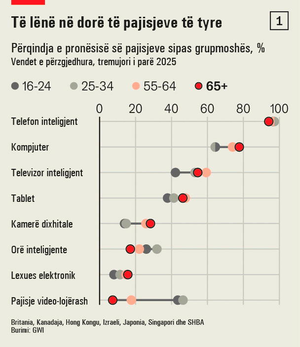 Të moshuarit mbi 65 vjeç kanë më shumë gjasa se të rinjtë nën 25 vjeç të kenë tableta, televizorë inteligjentë, lexues elektronikë dhe kompjuterë desktop apo laptop, sipas një ankete në shtatë vende të realizuar nga kompania kërkimore GËI.