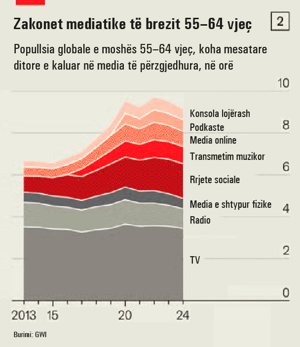Koha e lirë, lëvizshmëria e kufizuar dhe vetmia janë një recetë për të kaluar orë të tëra përpara ekranit: vitin e kaluar, personat mbi 75 vjeç në Britani kaluan mesatarisht më shumë se pesë orë e gjysmë në ditë duke parë televizor, pesë orë më shumë se grupmosha 16–24 vjeç, sipas autoritetit mediatik Ofcom.