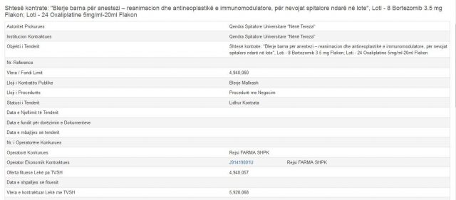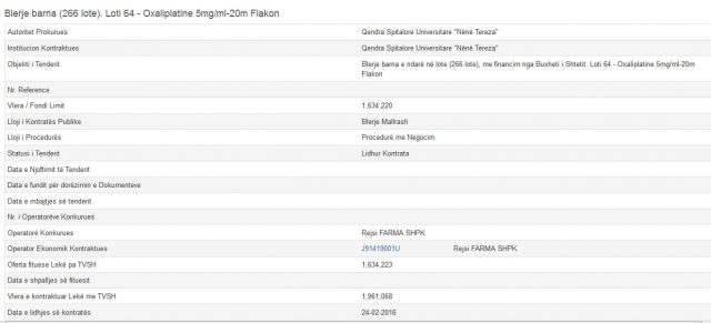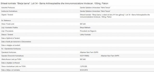 Nëse i referohemi këtë viti, kontratat për medikamentet oxaliplatin dhe irinotekan janë lidhur në muajt shkurt dhe mars.