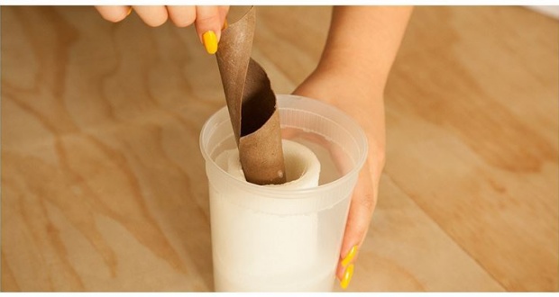 Matni se sa nga roleja zë ena me kapak, pastaj futeni rolenë brenda enës dhe hidhni përzierjen mbi të. Vendosini kapakun enës dhe kthejeni me kokë poshtë. Lëreni letrën të përthithë gjithë përzierjen. Pas disa minutash, hiqni kapakun dhe hiqini rolesë kartonin e mesit që mban letrat. Në fund, prisni një X në kapak dhe mbulojeni sërish enën me kapak. Prerja në formë X-i ju ndihmon t’i merrni letrat një nga një. Kështu, mund ta ruani përzierjen sa më gjatë, duke qenë se është e mbyllur.