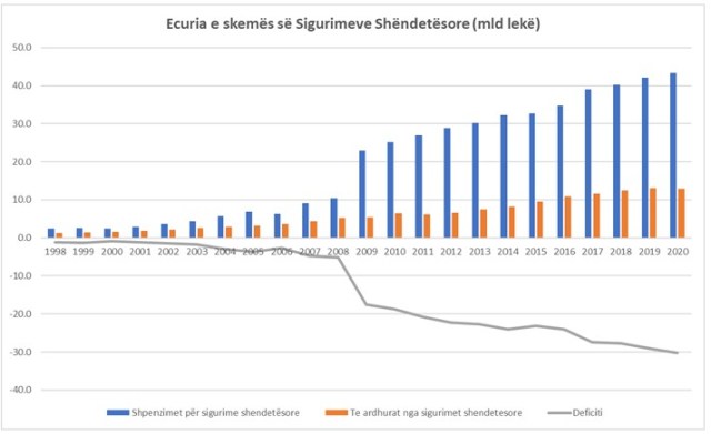 Deficiti i skemës së sigurimeve shëndetësore u zgjerua me 4.5 % gjatë vitit të kaluar. Gjatë vitit pandemik nevoja për shpenzime në shëndetësi u rrit, por ndërkohë të ardhurat nga kontributet u ndikuan negativisht nga rritja e papunësisë. Pas një rritje të qëndrueshme të ardhurat nga kontributet e sigurimeve pësuan rënie me 1 % vitin e kaluar krahasuar me vitin 2019. Gati tre të katërtat e skemës së sigurimeve shoqërore financohet nga taksat përgjithshme nëpërmjet buxhetit të shtetit. N