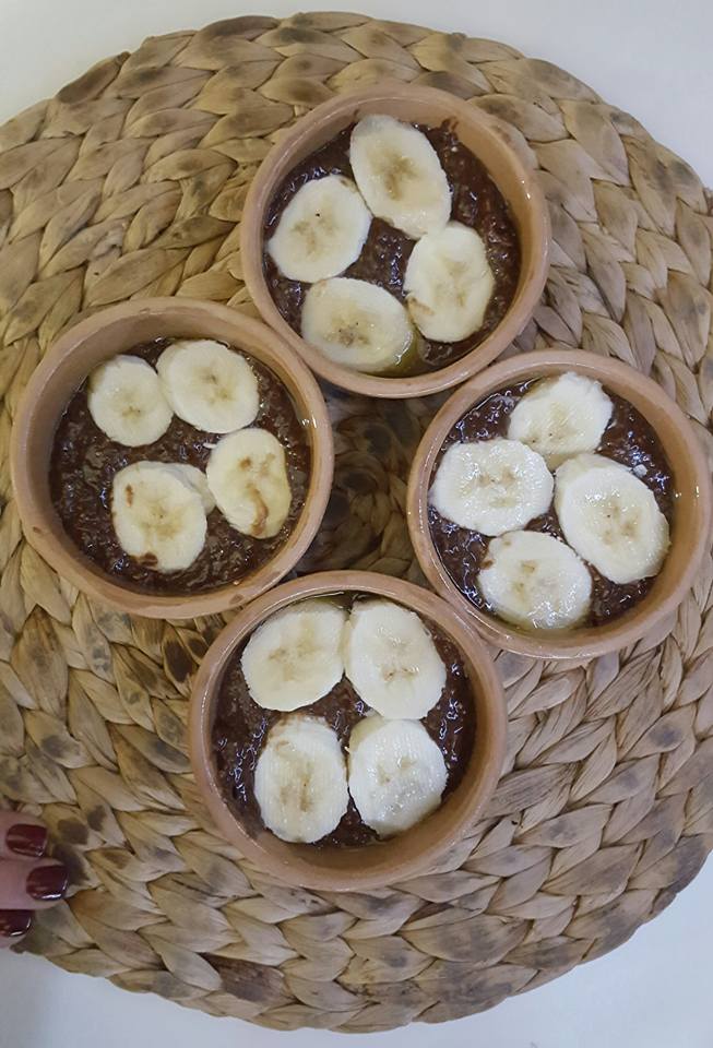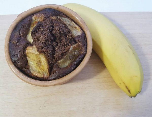 E shtroni përzierjen në një tepsi dhe e piqni për rreth 20 minuta në 180 gradë. E nxirrni nga furra dhe shtroni sipër molla të prerë në feta. E futni prapë në furrë për 10-15 minuta. Mund t’i hidhni edhe pak kakao dhe banane.
