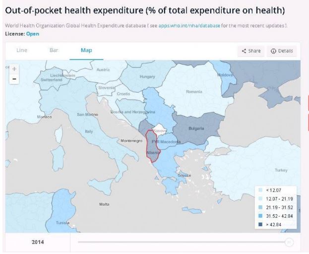 Madje, të dhënat, të cilat janë publike në faqen zyrtare të Bankës Botërore, tregojnë se qeveria jo vetëm që nuk i ka lehtësuar familjet nga kostot e kurimit, por i ka detyruar ato të shpenzojnë më shumë nga xhepi nëpër spitalet e vendit, private apo publike qofshin këto.