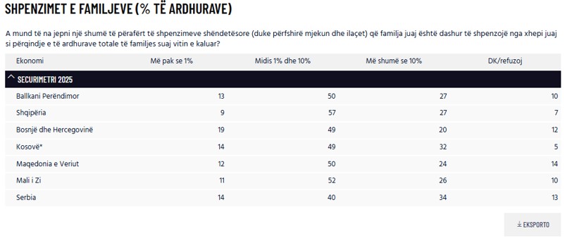 Sipas shifrave zyrtare të anketimit, rreth 57% e familjeve shqiptare deklarojnë se shpenzojnë midis 1% dhe 10% të të ardhurave të tyre totale për vizita mjekësore dhe barna. Ky grup përfaqëson shumicën dërrmuese të popullsisë dhe shënon nivelin më të lartë në të gjithë Ballkanin Perëndimor për këtë kategori.