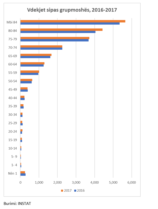 Rritja e personave që humbasin jetën është më e dukshme për moshat mbi 60 vjeç duke iu referuar edhe trendit historik, por në vitin 2017 në raport me një vit më parë (2016) vdekjet pësuan rritje për grupmoshën 50-60 vjeç dhe 20-24, vjeç si pasoje rritjes e aksidenteve rrugore.