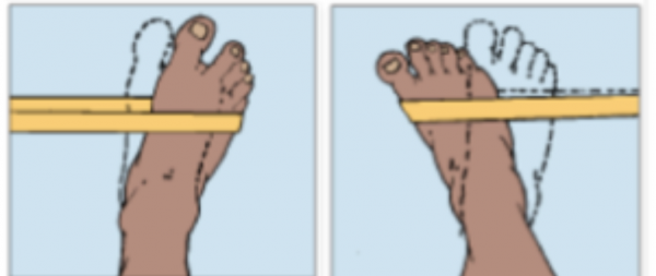 Sapo të arrini rreth 60-70 për qind të lëvizjeve normale të kaviljes, është e mundur që të filloni ushtrimet për fuqizimin muskulor duke përdorur një fashë gome elastike për rezistencë. Fiksojeni njërin ekstrem të fashës në një objekt siç mund të jetë këmba e një tavoline. Ekstremin tjetër kalojeni në pjesën e përparme të këmbës. Uluni me gjunjët e përkulur dhe shputat mbi dysheme. Tërhiqeni këmbën anash në fillim nga jashtë dhe më pas nga brenda kundrejt rezistencës së fashës, duke e lëvizur gjurin sa më pak që të jetë e mundur. Kthehuni ngadalë në pozicionin fillestar. Përsëritini ushtrimin disa herë (shih figurën djathtas).