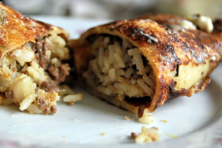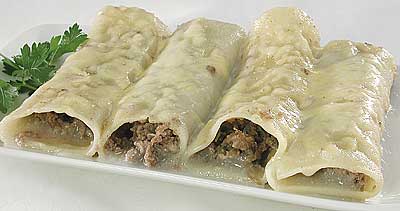 Përzihen së bashku, hidhet kripë, piper, dafinë, pak ujë dhe lihen në zjarr të ngadaltë për 10-15 minuta, derisa lëngu të avullojë. Në mes të petës vendosen 1-2 lugë kimë, mblidhet peta në formë roleje, duke futur anët brenda, dhe vihet në furrë. Spërkaten me gjalpë e djathë kaçkavall dhe piqen për 10-15 minuta. Në mungesë të furrës ose të tavës me korent, këto mund të skuqen lehtë nga të dyja anët.