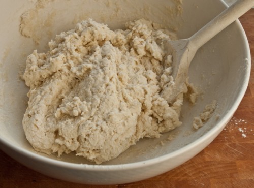 2. Në një tas të madh përzieni bashkë miellin, sheqerin e mbetur, pluhurin pjekës, sodën dhe gjysmë luge të vogël kripë. Shtoni 3 lugë gjalp të shkrirë dhe dhallë dhe përziejeni me lugë druri derisa të jetë bërë si brumë.