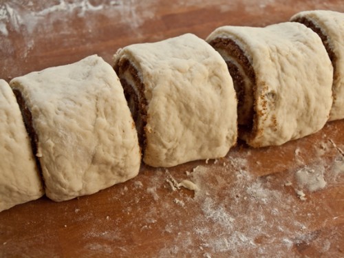 6. Priteni brumin e rrotulluar në 9 copa dhe rregullojini mirë copat në tepsinë e veshur nga brenda me letër alumini.
