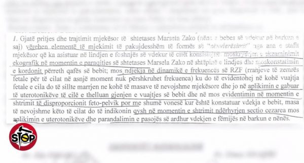“Gjatë pritjes dhe trajtimit mjekësor të shtetases Marsela Zako, (nënë e bebes së vdekur në barkun e saj) vërehen elementë të mjekimit të pakujdesshëm, të formës së “nënvlerësimit” nga ana e stafit mjekësor, që ka asistuar në lindjen e foshnjës së vdekur, ku konstatojmë: moskryerjen e ekzaminimit ekografik në momentin e paraqitjes së Marsela Zako, në shtëpinë e lindjes dhe mos konstatimin e kordonit përreth qafës së bebit; mos ndjekja e dinamikës së frekuencës së RZF, ku do të evidentohej në kohë vuajta fetale, e cila do të sillte marrjen në kohë të masave të nevojshme mjekësore dhe jo në aplikimin e gabuar të uterotonikëve, të cilët e thelluan gjendjen e vuajtjes së bebit dhe në mos evidentimin në momentin e shtrimit të disproporcionit feto – pelvik, por me shumë vonesë kur është konstatuar vdekja e bebit, masa të nevojshme këto, të cilat do të indikonin qysh në momentin e shtrimit të ndërhyrjes “sectio cezarea”; mos aplikimin e uterotonikëve dhe parandalimin e pasojës së ardhur për vdekjen e fëmijës në barkun e nënës.”