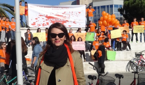 Në fund, të gjithë të rinjtë e pranishëm hipën mbi biçikleta dhe pedaluan në gjithë bulevardin Dëshmorët e Kombit të veshur me bluza portokalli dhe me slogane kundër dhunës në familje.