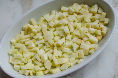 - 2 mollë të ëmbla, të qëruara, të prera në kubikë