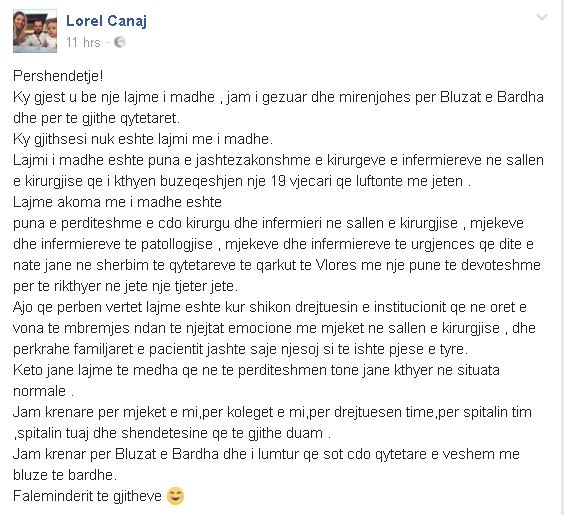 Shqipëria ka nevojë për mjekë dhe infermierë që ta konsiderojnë pacientin si familjarin e tyre dhe të bëjnë gjithçka për ta shpëtuar. Shqipëria ka nevojë për njerëz me shpirt human, si Lorel Canaj, infermieri nga Vlora që me një gjest shumë të vogël u kthye në shpëtimtar për pacientin.