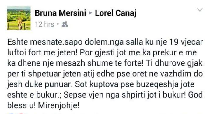 Gjestin human të Lorelit e përgëzoi ne një mesazh publik në rrjetin social Facebook edhe drejtoresha e Spitalit Rajonal të Vlorës, znj. Bruna Mersini, e cila shkruan: “ Është mesnatë, sapo dolëm nga salla ku një 19-vjeçar luftoi fort me jetën! Por gjesti jot më ka prekur e më ka dhënë një mesazh shumë të fortë! Ti dhurove gjak për t’i shpëtuar jetën atij, edhe pse në orët në vazhdim do jesh duke punuar. Sot kuptova pse buzëqeshja jote është e bukur. Sepse vjen nga shpirti jot i bukur! God bless u! Mirënjohje!”.