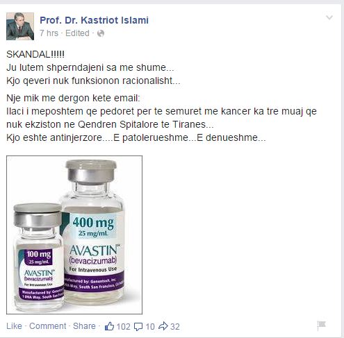 Në të thuhet: ” Skandal! Ilaçi i mëposhtëm që përdoret për të sëmurët me kancer ka tre muaj që nuk ekziston në Qendrën Spitalore të Tiranës. Kjo është antinjerëzore, e patolerueshme, e dënueshme!”. Sipas denoncimeve, ilaçi blihet dorazi në një kohë që sipas ligjit, këto ilaçe duhet të jepen falas.