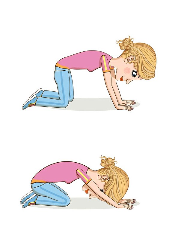 Ulni të katër gjymtyrët në dysheme. Merrni frymë ngadalë ndërkohë që gjithë peshën e trupit e keni përqendruar tek duart dhe këmbët. Më pas e vendosni kokën në tokë, mes krahëve, ndërsa vithet tek këmbët.