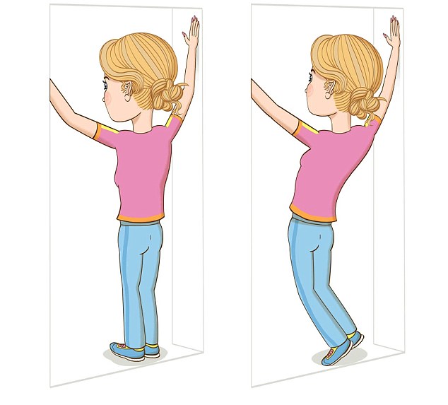Qëndroni para një dere ose muri. Mbështetni duart tek anësoret e derës ose murit, në formën V. Përkuluni pak mbrapa duke e tendosur sa më shumë shpinën.