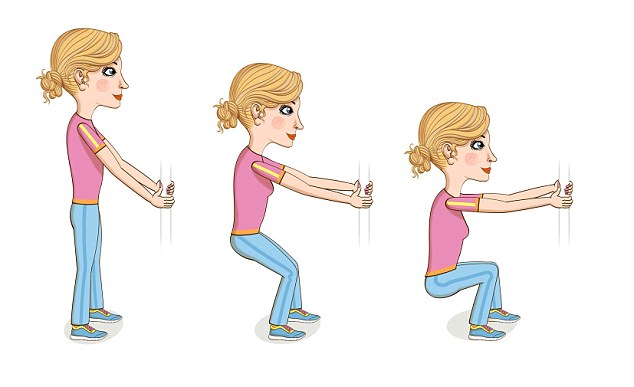 Qëndroni në këmbë me njërën dorë të mbështetur tek pjesa e pasme e karriges. Përkulini pak këmbët ndërkohë që mbështeteni fort tek karrigia. Ulini dhe ngrihuni disa herë, dhe ndjejeni tendosjen tek shpina.