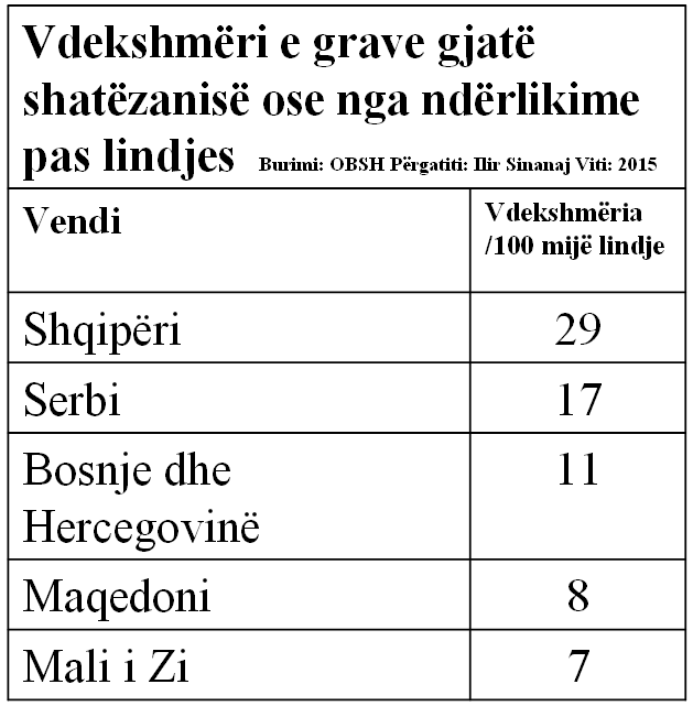 Në Shqipëri raporti i vdekshmërisë së grave si pasojë e ndërlikimeve shëndetësore, gjatë ose pas shtatzënisë është 29 në 100 mijë gra.