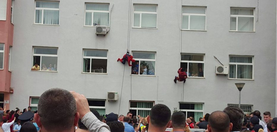 Të veshur si “Batman” dhe “Spiderman”, policët kanë përshëndetur fëmijët duke zbritur nga tarraca e godinës së pediatrisë, më pas janë ulur pranë vogëlushëve për t’i përshëndetur nga afër.